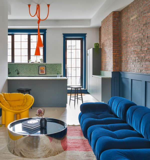 Bright laconic studio living room in blue tones with the finest taste combines minimalism with expressive accents, creating an atmosphere of energy and sophistication. The space is both open and cozy, where every detail works for harmony and visual purity.